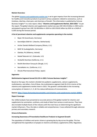 Vitamins and Supplements Industry Report Overview Growth, Size & Share Forecast, 2032