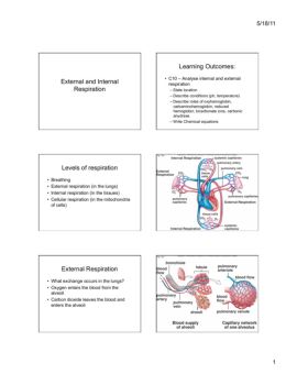 5/18/11 2 Internal Respiration • What exchange of gases occurs at the tissues? • Oxygen leaves the blood diffuses first into tissue fluid, then into cells