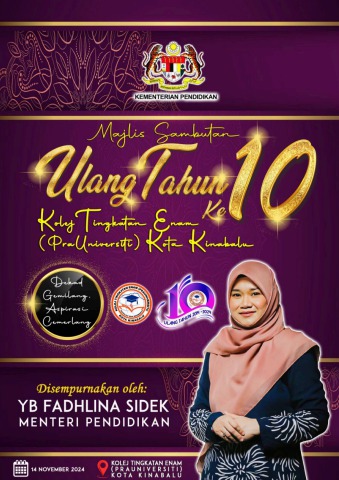 Buku Program Majlis Sambutan Ulang Tahun ke-10 Kolej Tingkatan Enam (Prauniversiti) Kota Kinabalu Sabah yang dirasmikan oleh Menteri Pendidikan Malaysia YB. Fadhlina Sidek. Buku program ini mengandungi ucapan, atur cara majlis , latar belakang KTEKK, senarai pengetua, gambar-gambar tentang kolej