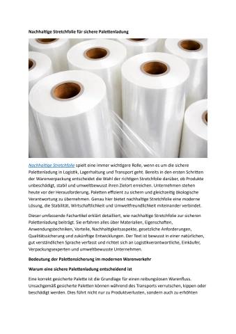 Nachhaltige Stretchfolie spielt eine immer wichtigere Rolle, wenn es um die sichere Palettenladung in Logistik, Lagerhaltung und Transport geht. Bereits in den ersten Schritten der Warenverpackung entscheidet die Wahl der richtigen Stretchfolie darüber, ob Produkte unbeschädigt, stabil und umweltbewusst ihren Zielort erreichen. Unternehmen stehen heute vor der Herausforderung, Paletten effizient zu sichern und gleichzeitig ökologische Verantwortung zu übernehmen. Genau hier bietet nachhaltige Stretchfolie eine moderne Lösung, die Stabilität, Wirtschaftlichkeit und Umweltfreundlichkeit miteinander verbindet.