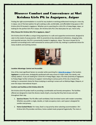Whether you're a student or a professional, finding the right Girls PG in Pratap Nagar, Jaipur or in any other part of the city can make all the difference in your living experience. Shri Krishna Girls PG in Jagatpura offers a perfect blend of comfort, safety, and convenience, making it the ideal choice for girls looking to settle in Jaipur. With its excellent facilities, prime location, and affordable rates, Shri Krishna Girls PG is truly your home away from home in Jaipur.