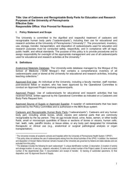 1 Title: Use of Cadavers and Recognizable Body Parts for Education and Research Purposes at the University of Pennsylvania Effective Date: Responsible Office: Vice ...