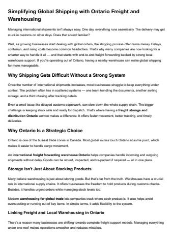 Well, as growing businesses start dealing with global orders, the shipping process often turns messy. Delays, confusion, and rising costs become common headaches. That's why many companies are now looking for a smarter way to handle it all — and that starts with end-to-end freight forwarding backed by strong local warehouse support. If you're operating out of Ontario, having a nearby warehouse can make global shipping far more manageable. https://www.3planywhere.com/freight-forwarding-services/