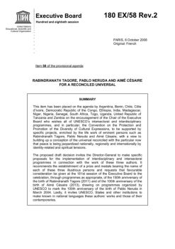 Executive Board 180 EX/58 Rev.2 Item 58 of the provisional agenda RABINDRANATH TAGORE, PABLO NERUDA AND AIMÉ CÉSAIRE FOR A RECONCILED UNIVERSAL