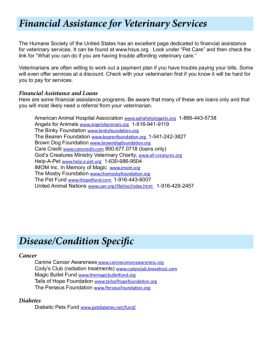 Financial Assistance for Veterinary Services The Humane Society of the United States has an excellent page dedicated to financial assistance for veterinary services.