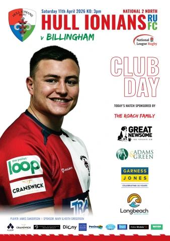 Matchday programme for Hull Ionians RUFC v Billingham RC Saturday 11th April 2026
