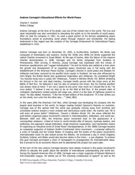Despite the suspicions of radical pacifists, Carnegie’s gift to promote peace education was the largest in history to that time. The Carnegie Endowment for ...
