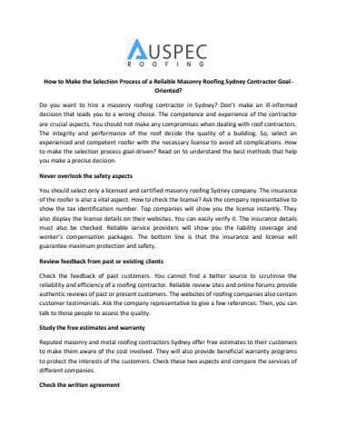 Do you want to hire a masonry roofing contractor in Sydney? Don’t make an ill-informed decision that leads you to a wrong choice. The competence and experience of the contractor are crucial aspects.
