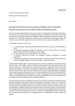 1 10 June 2015 To HE Dr. Nkosazana Dlamini Zuma Chairperson of the African Union Dear Madam, Open letter to the African Union on the resurgence of xenophobic violence ...