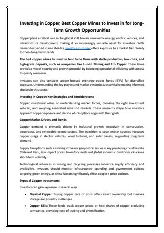 Copper plays a critical role in the global shift toward renewable energy, electric vehicles, and infrastructure development, making it an increasingly valuable asset for investors. With demand expected to rise steadily, investing in copper offers exposure to a market tied closely to these long-term trends.