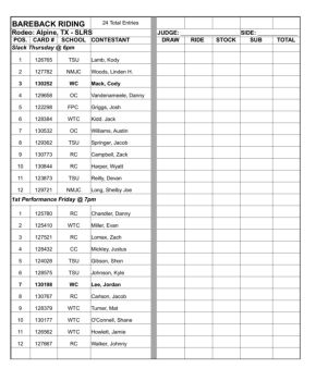 bareback riding 24 total entries rodeo: alpine, tx - slrs judge: _____ side: _____ pos. card # school contestant draw ride stock sub total