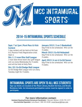 MCC Intramural Sports Sept. 7 at 2pm | Punt Pass & Kick Contest 1 day contest will be held at McCook H.S. Practice Field. Registration ends Sept. 6.