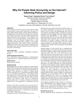 - 1 - Why Do People Seek Anonymity on the Internet? Informing Policy and Design Ruogu Kang1, Stephanie Brown2, Sara Kiesler1 Human Computer Interaction Institute1