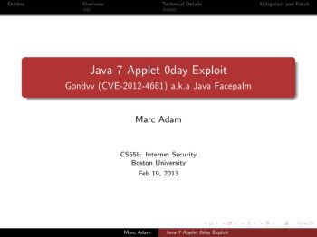 Outline Overview Technical DetailsMitigation and Patch Java 7 Applet 0day Exploit Gondvv (CVE-2012-4681) a.k.a Java Facepalm Marc Adam CS558: Internet Security