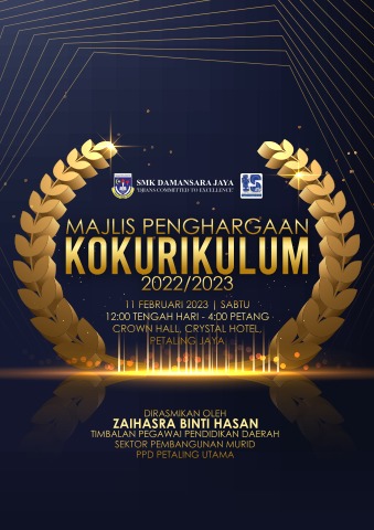 Majlis Penghargaan Kokurikulum 2022/2023 SMK Damansara Jaya<br><br>11 Februari 2023 | Sabtu<br>12:00 Tengah Hari - 4:00 Petang<br>Crown Hall, Crystal Hotel, Petaling Jaya<br><br>Dirasmikan oleh<br>Puan Zaihasra binti Hasan<br>Timbalan Pegawai Pendidikan Daerah<br>Sektor Pembangunan Murid<br>PPD Petaling Utama