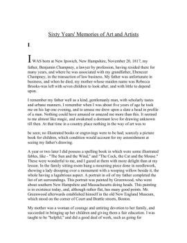 Sixty Years' Memories of Art and Artists. I. I WAS born at New Ipswich, New Hampshire, November 20, 1817, my father, Benjamin Champney, a lawyer by profession, having ...