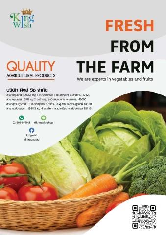 King Wish company has established more than 14 years.<br>We are operate as production fresh vegetables delivery<br>to Hypermarket, Department store, Food factory and<br>Food delivery. We have source raw material cover<br>in Thailand and import fresh vegetables from China.<br><br>Our packing house has been certified of the food safety<br>management systems GHPs and HACCP. We can supply<br>our products to my customers all time, This makes us<br>different. And you can ensure our product that free<br>from residue because “we cares, devoted every farms”.
