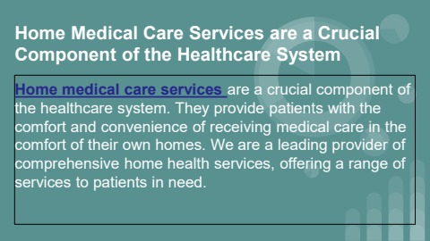 Home medical care services are a crucial component of the healthcare system. They provide patients with the comfort and convenience of receiving medical care in the comfort of their own homes. We are a leading provider of comprehensive home health services, offering a range of services to patients in need.