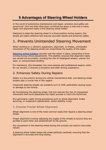 Steering wheel holders securely lock the wheel in place, preventing it from turning during critical adjustments. This stability ensures that alignment tasks are carried out accurately, avoiding the risk of misaligned wheels, uneven tire wear, or compromised handling.