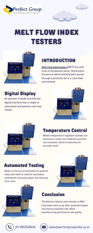 For evaluating thermoplastic polymers' flow characteristics, Perfect Group's Melt Flow Index Testers are essential. By monitoring the melt flow rate with these precise sensors, uniform material performance and quality are ensured. These findings are accurate and dependable since they are equipped with superior temperature control, digital display, and compliance with international standards (ASTM D1238, ISO 1133). Perfect Group’s MFI testers facilitate stringent quality assurance procedures by improving manufacturing efficiency and product consistency, making us perfect for quality control in the plastics industry.