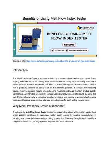Accurate measurement of polymer flow features is guaranteed by using a Melt Flow Index Tester, helping manufacturers in fulfilling industry standards and maintaining constant product quality. It lowers waste, increases material selection, and improves worker productivity. Industries support testing solutions from Perfect Group India, a top manufacturer of high-quality testing equipment, for reliable performance and trustworthy outcomes.