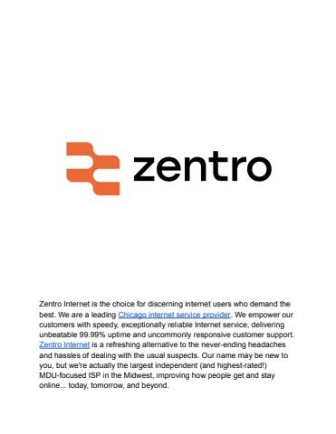 Zentro Internet is the choice for discerning internet users who demand the best. We are a leading Chicago internet service provider. We empower our customers with speedy, exceptionally reliable Internet service, delivering unbeatable 99.99% uptime and uncommonly responsive customer support. Zentro Internet is a refreshing alternative to the never-ending headaches and hassles of dealing with the usual suspects. Our name may be new to you, but we're actually the largest independent (and highest-rated!) MDU-focused ISP in the Midwest, improving how people get and stay online... today, tomorrow, and beyond.