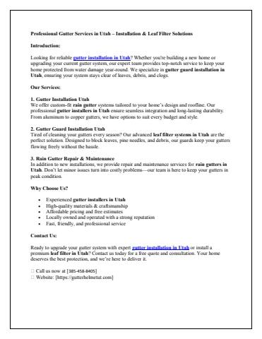 Looking for expert gutter installation in Utah? This PDF guide covers everything you need to know about professional gutter installers in Utah, top-rated gutter guard installation, and advanced leaf filter solutions in Utah. Discover how to protect your home from water damage with high-quality rain gutter systems designed to last. Whether you're interested in new installation, repair, or clog-free gutter protection, this resource connects you with trusted local pros ready to help.