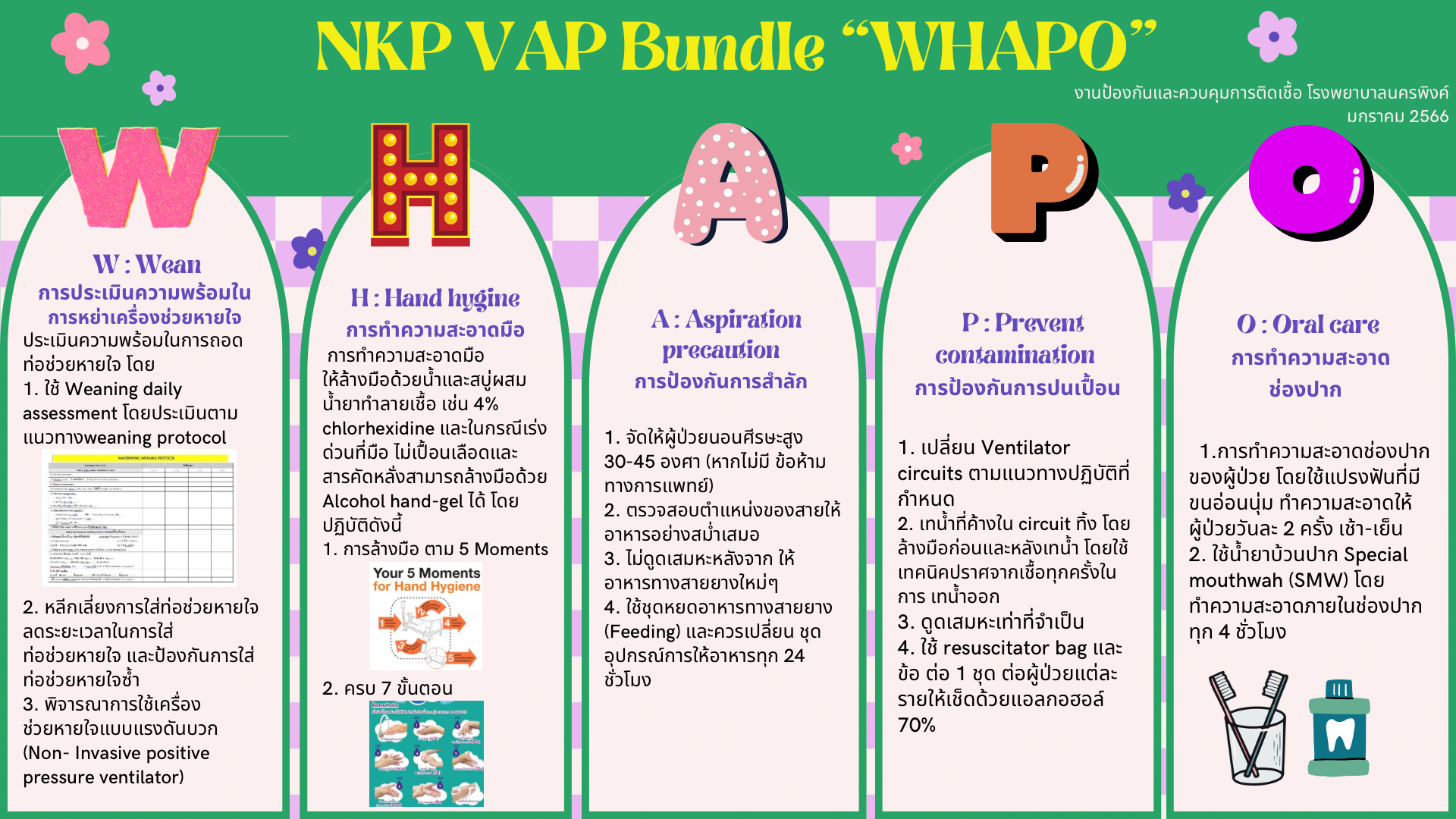 W : Wean การประเมินมิความพร้อ ร้ มใน การหย่า ย่ เครื่อรื่งช่ว ช่ ยหายใจ ประเมินมิความพร้อร้มในการถอด ท่อช่วช่ยหายใจ โดย 1. ใช้ Weaning daily assessment โดยประเมินมิตาม แนวทางweaning protocol 2. หลีกเลี่ยงการใส่ท่ส่ ท่อช่วช่ยหายใจ ลดระยะเวลาในการใส่ ท่อช่วช่ยหายใจ และป้อป้งกันการใส่ ท่อช่วช่ยหายใจซ้ํา 3. พิจพิารณาการใช้เช้ครื่อรื่ง ช่วช่ยหายใจแบบแรงดันดับวก (Non- Invasive positive pressure ventilator) NKP VAP Bundle “WHAPO” H : Hand hygine การทําความสะอาดมือมื การทําความสะอาดมือมื ให้ล้ห้ ล้างมือมืด้วด้ยน้ําและสบู่ผบู่สม น้ํายาทําลายเชื้อชื้เช่นช่ 4% chlorhexidine และในกรณี เร่งร่ด่วด่นที่มือมื ไม่เม่ ปื้อนเลือดและ สารคัดหลั่งลั่สามารถล้างมือมื ด้วด้ย Alcohol hand-gel ได้ โดยปฏิบัติบั ติดังดันี้ 1. การล้างมือมืตาม 5 Moments 2. ครบ 7 ขั้นขั้ตอน O : Oral care การทําความสะอาด ช่อ ช่ งปาก 1.การทำ ความสะอาดช่อช่งปาก ของผู้ป่ผู้ วป่ย โดยใช้แช้ ปรงฟันฟัที่มี ขนอ่อนนุ่มนุ่ ทําความสะอาดให้ ผู้ป่ผู้ วป่ยวันวัละ 2 ครั้งรั้เช้าช้-เย็น ย็ 2. ใช้น้ํช้ น้ํ ายาบ้วบ้นปาก Special mouthwah (SMW) โดย ทําความสะอาดภายในช่อช่งปาก ทุกทุ 4 ชั่วชั่โมง P : Prevent contamination การป้องกันการปนเปื้อน 1. เปลี่ยน Ventilator circuits ตามแนวทางปฏิบัติบั ติที่กําหนด 2. เทน้ําที่ค้างใน circuit ทิ้ง โดย ล้างมือมืก่อนและหลังเทน้ํา โดยใช้ เทคนิคนิ ปราศจากเชื้อชื้ทุกทุครั้งรั้ใน การ เทน้ําออก 3. ดูดดูเสมหะเท่าที่จําจํเป็น ป็ 4. ใช้ resuscitator bag และ ข้อข้ต่อ 1 ชุด ต่อผู้ป่ผู้ วป่ยแต่ละ รายให้เห้ช็ด ช็ ด้วด้ยแอลกอฮอล์ 70% A : Aspiration precaution การป้อ ป้ งกันการสําสํลัก 1. จัดจั ให้ผู้ห้ ป่ผู้ วป่ยนอนศีรษะสูงสู 30-45 องศา (หากไม่มีม่ มีข้อข้ห้าห้ม ทางการแพทย์)ย์ 2. ตรวจสอบตําแหน่งน่ของสาย ให้อห้าหารอย่าย่งสม่ำ เสมอ 3. ไม่ดูม่ดดูเสมหะหลังจาก ให้ อาหารทางสายยางใหม่ๆม่ 4. ใช้ชุช้ชุดหยดอาหารทางสายยาง (Feeding) และควรเปลี่ยน ชุด อุปกรณ์กณ์ารให้อห้าหารทุกทุ 24 ชั่วชั่โมง งานป้อป้งกันและควบคุมคุการติดเชื้อชื้ โรงพยาบาลนครพิงพิค์ มกราคม 2566