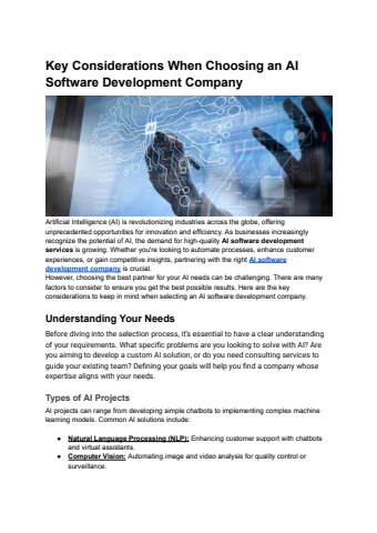 Artificial Intelligence (AI) is revolutionizing industries across the globe, offering unprecedented opportunities for innovation and efficiency. As businesses increasingly recognize the potential of AI, the demand for high-quality AI software development services is growing. Whether you're looking to automate processes, enhance customer experiences, or gain competitive insights, partnering with the right AI software development company is crucial. However, choosing the best partner for your AI needs can be challenging. There are many factors to consider to ensure you get the best possible results. Here are the key considerations to keep in mind when selecting an AI software development company.
