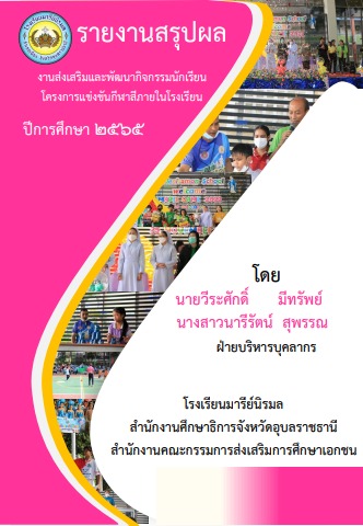 รายงานสรุปผลโครงการแข่งขันกีฬาภายใน (กีฬาสี) ปีการศึกษา 2565<br>โดย<br>นายวีระศักดิ์ มีทรัพย์<br>นางสาวนารีรัตน์ สุพรรณ
