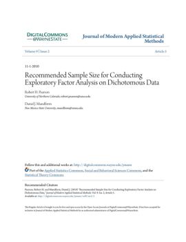 Journal of Modern Applied Statistical Methods Volume 9|Issue 2 Article 5 11-1-2010 Recommended Sample Size for Conducting Exploratory Factor Analysis on Dichotomous Data