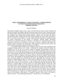 The Journal of Baptist Studies 3 (2009): 24-32. 24 “TRULY REFORMED IN A GREAT MEASURE”: A BRIEF DEFENSE OF THE ENGLISH SEPARATIST ORIGINS OF