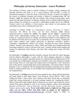Philosophy of Literacy Instruction – Laura Weakland The teaching of literacy needs to include a balance of reading, writing, speaking and listening activities and ...