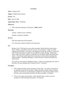 Lab Safety Name: Schuyler Huff Subject: Middle School Science Period: First Date: June 29, 2009 Approximate Time: 50 Minutes Objectives: 1. TSW realize the importance ...