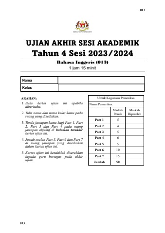BAHASA INGGERIS (013) TAHUN 4 2024