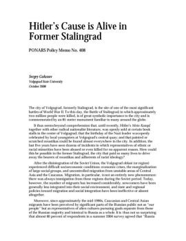 Hitler’s Cause is Alive in Former Stalingrad PONARS Policy Memo No. 408 Sergey Golunov ... scratched swastikas could be found almost everywhere in the city.