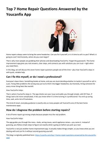 Home repairs always seem to bring the same headaches. Can you fix it yourself, or is it time to call in a pro? What’s it going to cost? And honestly, where do you even begin? That is why more people are grabbing their phones and downloading YouCanFix. Forget the guesswork. This home improvement app gives you real answers, clear steps, and connects you with solutions you can trust—right when you need them. In this blog, we will discuss the seven home repair questions people ask all the time—plus how YouCanFix steps in with quick, reliable help. For more information visit here: https://ucanfix.com/top-7-home-repair-questions-answered-by-the-youcanfix-app/
