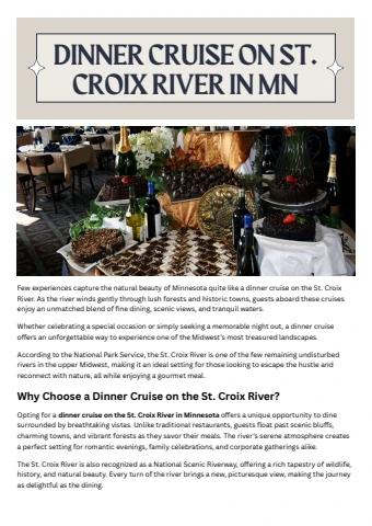 Experience the enchanting beauty of the St. Croix River with our exquisite dinner cruise, where culinary delights meet breathtaking scenery. As you glide along the serene waters, indulge in a gourmet meal prepared with fresh, local ingredients while taking in the stunning views of lush landscapes and charming riverside towns. This unforgettable evening combines fine dining with the tranquility of nature, making it the perfect setting for a romantic date night or a special celebration. Book your dinner cruise today and create lasting memories on the picturesque St. Croix River.