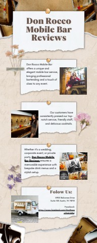 Don Rocco Mobile Bar offers a unique and elegant mobile bar service, bringing professional bartending and a touch of class to any event. Our customers have consistently praised our top-notch service, friendly staff, and delicious cocktails. Whether it's a wedding, corporate event, or private party, Don Rocco Mobile Bar ensures a memorable experience with bespoke drink menus and a stylish setup.