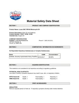 Material Safety Data Sheet. SECTION 1 PRODUCT AND COMPANY IDENTIFICATION Product Name: Lucas SAE 10W-40 Motorcycle Oil . Product Description: Base Oil and Additives