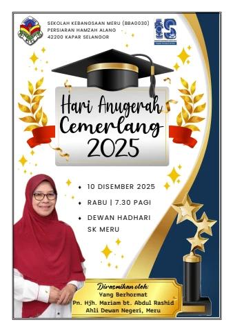 HARI ANUGERAH CEMERLANG SK MERU 2025<br>RABU 10 DISEMBER 2025<br>7.30 PAGI<br>DEWAN HADHARI