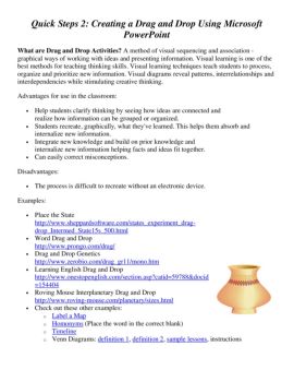 Quick Steps 2: Creating a Drag and Drop Using Microsoft PowerPoint What are Drag and Drop Activities? A method of visual sequencing and association -