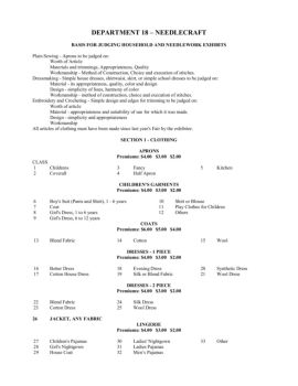 DEPARTMENT 18 – NEEDLECRAFT BASIS FOR JUDGING HOUSEHOLD AND NEEDLEWORK EXHIBITS Plain Sewing - Aprons to be judged on: Worth of Article Materials and trimmings ...