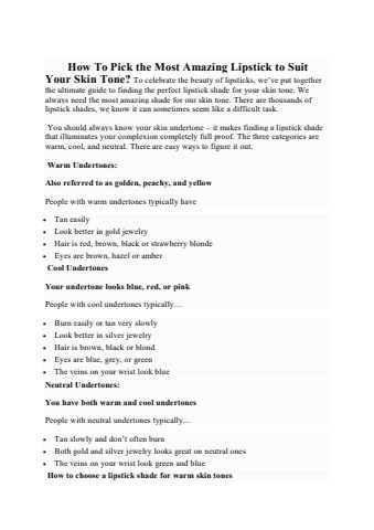 You should always know your skin undertone – it makes finding a lipstick shade that illuminates your complexion completely full proof. The three categories are warm, cool, and neutral. There are easy ways to figure it out.