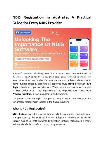 Understand NDIS registration in Australia, including provider requirements, audits, compliance responsibilities, and how to become a registered NDIS provider. Web: https://www.kareconnect.com.au/blog/how-ndis-providers-in-australia-can-manage-operations-more-efficiently-with-a-crm