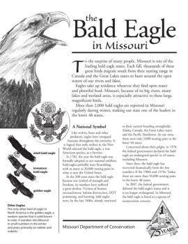 Bald Eagle in Missouri the T o the surprise of many people, Missouri is one of the leading bald eagle states. Each fall, thousands of these great birds migrate south ...