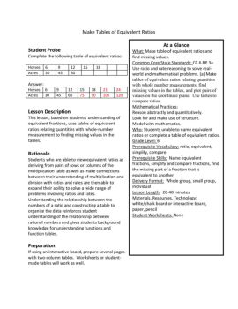 Make Tables of Equivalent Ratios At a Glance Student Probe Complete the following table of equivalent ratios: Horses 6 9 12 15 18 Acres 30 45 60
