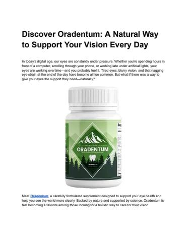 Oradentum is a natural eye health formula designed to support and enhance vision. It combines potent ingredients to protect eyes, reduce strain, and support long-lasting eye wellness.