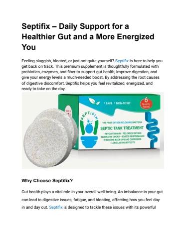 Septifix is a premium supplement crafted to improve gut health, boost digestion, and enhance daily energy. It combines powerful ingredients like probiotics, enzymes, and fiber for overall well-being.