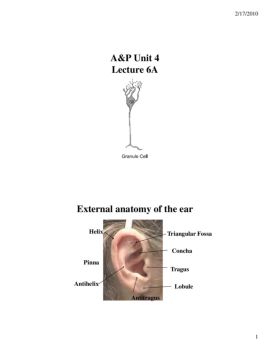 2/17/2010 1 A&P Unit 4 Lecture 6A External anatomy of the ear Pinna Helix Antihelix Tragus Antitragus Triangular Fossa Concha Lobule